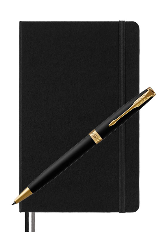 Parker Sonnet Matte Black Gt Moleskine от официального дилера Parker в Новокуйбышевске. Вы можете дополнительно заказать гравировку, которая подчеркнет Вашу оригинальность и придаст памятность статусному подарку. Все ручки Паркер поставляются в фирменном футляре.
